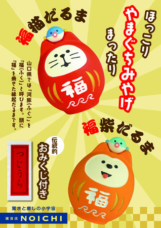山口県内の雑貨店「NOICHI(ノイチ)」は、幅広い世代に人気のまったりマスコット「コンコンブル」と山口名産「フク(河豚)」、伝統的おみくじ「つじうら」を融合した新商品「《おみくじ付》福猫だるま」と「《おみくじ付》福紫だるま」各1,485円(税込)の販売を、1月より直営店舗や公式ネットショップなどにて開始した。