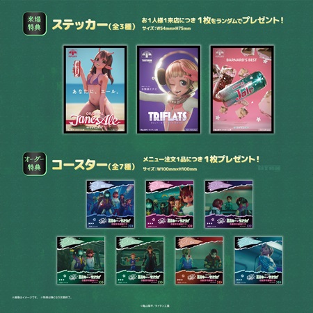 さらに、来場特典として、ステッカーを用意。全3種で、1人1来店につきランダムで1枚もらえる。オーダー特典としては、コースター全7種を用意。メニュー注文1品につき1枚もらえる。