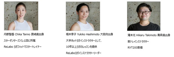 講師は、ReLaboヨガフィットマスタートレイナーの丹野智香さん、ReLaboヨガインストラクターリーダーの橋本幸子さん、筋トレインストラクターの滝本光さん、
