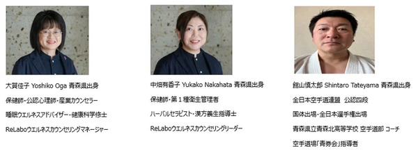 保健師・公認心理師・産業カウンセラーの大賀佳子さん、保健師・第1種衛生管理者の中畑有香子さん、空手指導者の館山慎太郎さん、