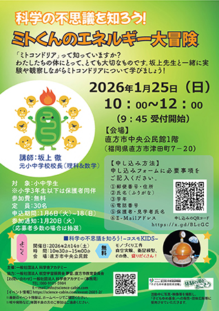 福岡県直方市は、1月25日(日)、科学舎アカデミー主催による科学イベント「科学の不思議を知ろう!ミトくんのエネルギー大冒険」を直方市中央公民館で開催する。