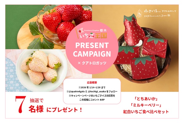 応募方法は、クアトロガッツ公式Xと栃木県大阪センター公式Xをフォローし、キャンペーン投稿に上記画像の「いちごクイズ」の回答をコメントし、リポストすること。