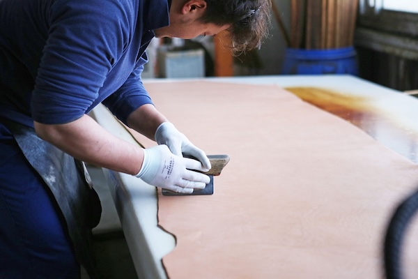 栃木レザー社の「フルベジタブルタンニンレザー」は、化学物質を一切使わずに、環境への負荷の少ないミモザをはじめとする100%植物性のタンニンで鞣されているため、自然分解され土に還る素材だ。使い込むほどに色艶が増し手に馴染む、十人十色の経年変化を楽しめるだろう。