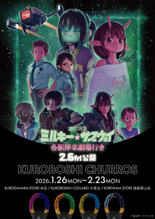 米粉チュロス専門店「KUROBOSHI」では、栃木県那須町の「KURODAHARA STORE 那須本店」、埼玉県さいたま市の「KUROBOSHI×COLLABO 大宮店」、福島県郡山市の「KORIYAMA STORE 福島郡山店」の3店舗にて、劇場版『銀河特急 ミルキー☆サブウェイ 各駅停車劇場行き』とのコラボレーション企画を実施する。