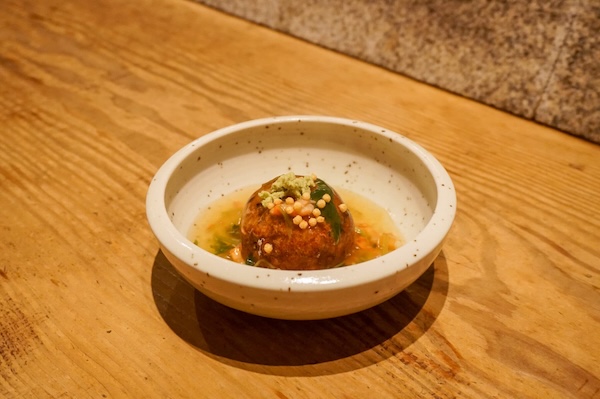 蓮根まんじゅうのカニあんかけ。蓮根のほくほくとした優しさに、とろりとしたカニの旨味がふんわりと重なる。言葉より先に、安心が広がる。