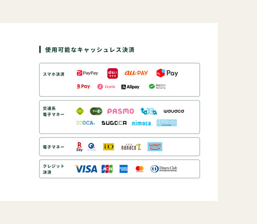 支払い方法は、スマホ決済、交通系電子マネー、電子マネー、クレジット決済が利用可能だ。