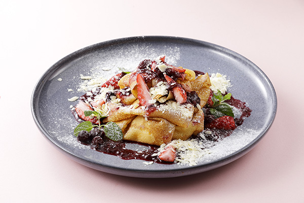 ゲートタワープラザ12階のBARBARA 焼きたてパンとビストロ料理では、苺とホワイトチョコとローストピスタチオアイスのクレープが1,480円で味わえる。