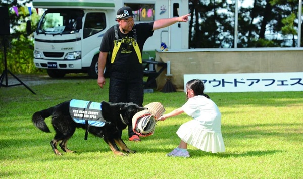 警察犬デモンストレーションでは、服従訓練から犯人追跡まで、警察犬の鋭い動きを見ることができる。