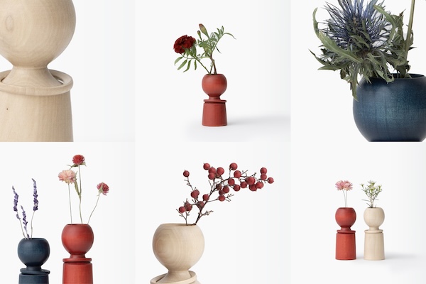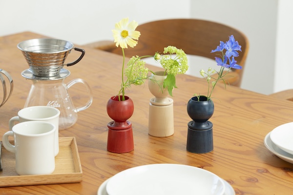 こけしを手がけるのは、「東京こけし」と銘打って八王子で40年余りこけしを作り続けてきた挽物の熟練職人。白さ際立つ無垢のこけしに美しい色を吹き込んだのは、台東区蔵前でアトリエ兼ショップを構える天然染色、草木染めの職人。2つの技が出会い、草花を彩るための一輪挿しの優しいこけしが誕生した。