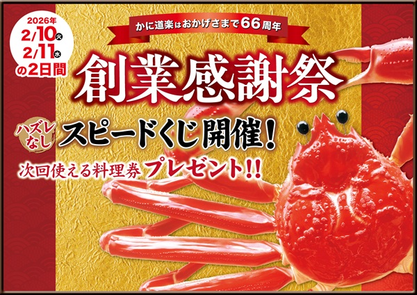 今年で創業66周年を迎えた「かに道楽」が、西日本地区限定の創業感謝祭を2月10日(火)、11日(水・祝)の2日間限定で開催。