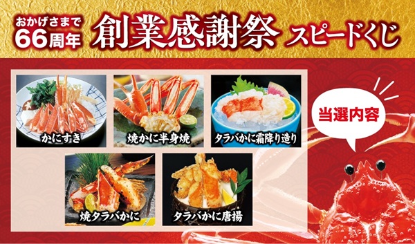 「かに道楽」西日本地区限定で創業感謝祭を2日間開催。ハズレなしのスピードくじは要チェック!