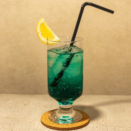 「奈落ソーダ」は、メロンベースにオレンジピールのほのかな苦味をプラス。月をイメージしたレモンが付いている。