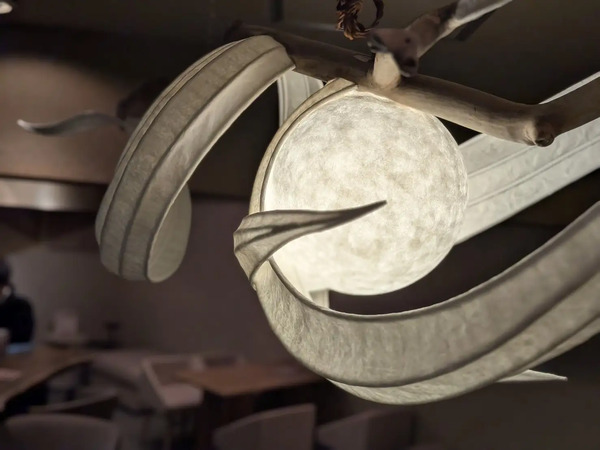 職人が制作したモルタルのベンチをテーブルとして使ったり、流木と和紙であたたかな灯りをつくるブランド「あんどん」の照明を採用したりと、人の手が生み出す温度を感じてもらえる工夫も随所に施されている。