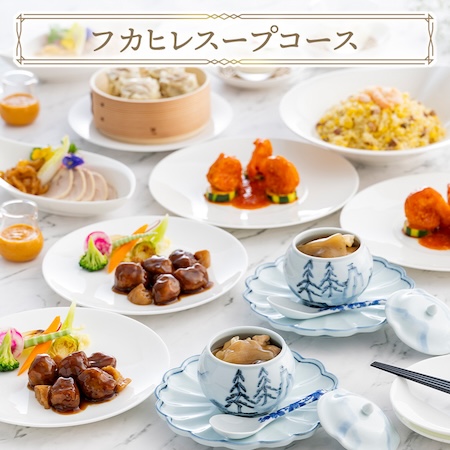 「おうちで東天紅コース」に「ふかひれときのこの頂上スープ」を加えた、「おうちで東天紅 フカヒレスープコース」が18,360円(税込)。