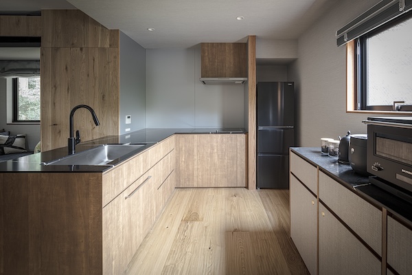 「SHIKI -HAKONE-」のヴィラには、オーダーキッチンとドイツ製のIHコンロ、充実した調理器具や食器類が揃う。広々としたゆとりあるキッチンで料理を楽しめる。
