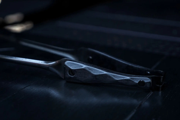 「BLACK EMBER FANG」のグリップには、北欧家具でも重用される「森の女王」ビーチ材(ブナ材)を使用。その一つ一つにブラック塗装、名栗彫りが施されており、手に馴染む名栗彫りの凹凸は汗や油でも滑りにくく、手の大きさを問わず自然にフィットするという。