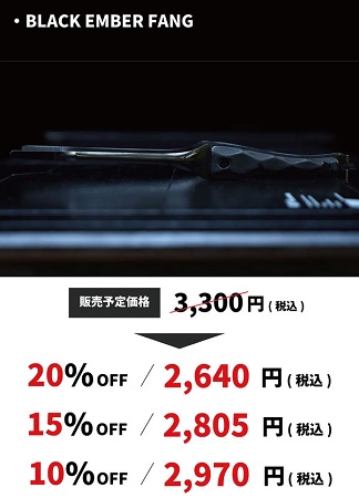Makuakeでは、「BLACK EMBER FANG」の販売予定価格3,300円(税込)を、お得な割引価格で販売中。