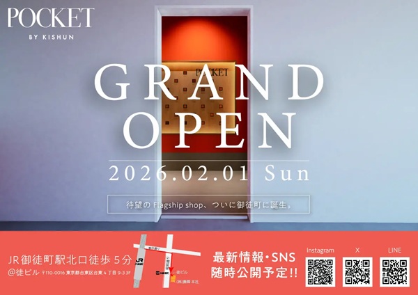 スタッフは、「これまではマルシェなど、イベントでしかお会いすることができす、歯がゆい気持ちでいっぱいでしたが、店舗がオープンすることでいつでも皆様にお会いすることができます。実際に手に取り、身につけ、選ぶ楽しさを感じていただける場として、『POCKET BY KISHUN』の世界観を体感できる店舗をお届けします」とコメントしている。