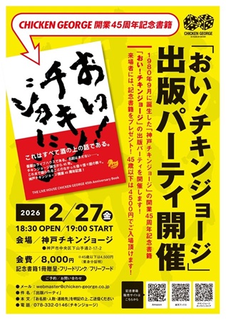 ライブハウス「神戸チキンジョージ」の歴史が詰まった45周年記念書籍「おい!チキンジョージ」1,980円(税込)が、2月27日(金)に発売される。