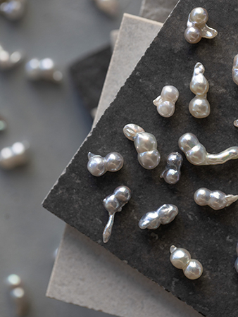 日本の真珠業界では、古くから「美しい真珠=丸い・キズがない・強い光沢がある」という厳しい品質基準が設けられてきた。これにより、あこや真珠のブランド信頼性は確立されたが、一方で基準に満たない“規格外”とされる真珠も多く存在するそう。形が不揃いなため製品化が難しく、市場で十分に評価されてこなかったものの中には、いびつながらも個性的で特別な輝きを放つ真珠がある。