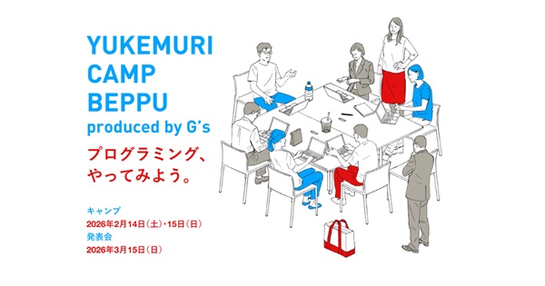デジタルハリウッドが運営するエンジニアと起業の学校「G’s(ジーズ)」は、別府市産業連携・協働プラットフォーム「B-biz LINK」が主催するプログラミングキャンプ「YUKEMURI CAMP BEPPU produced by G’s」の企画運営を担当し、2月14日(土)・15日(日)に別府市レンガホールにて開催する。