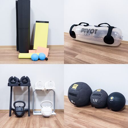 ピラティスマシンの他に、多彩なトレーニング備品やコンディショニングツールを導入。足裏の感覚を刺激して脳を活性化させる「ナボソボール」や、水の動きでインナーマッスルを鍛える「ウォーターバッグ」などが用意されている。