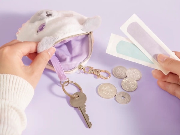 付けたまま伸ばして使えるほか、ファスナー付きのポーチも備えており、リップクリーム・絆創膏・小銭などのちょっとした小物や鍵の収納に便利だ。