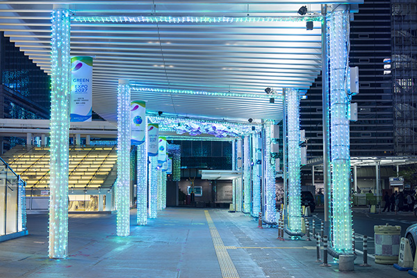 「ヨコハマイルミネーション2025 “ヨコハマイルミナスクエア”」での使⽤発光体総数は約11万球、ネオンチューブライトの総延⻑は約900メートル。さらに横浜駅西口周辺では、2027年国際園芸博覧会(GREEN×EXPO 2027)開催を1年後にひかえ、“芽⽣え”をイメージしたブルーグリーンのカラーによる演出を楽しめる。