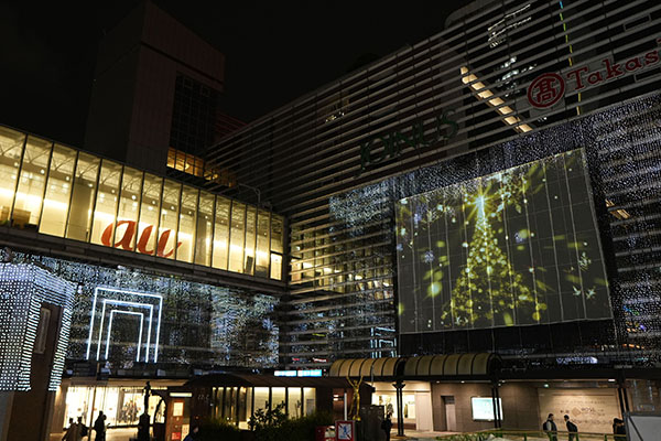 140メートルを超えて街をつなぐ“光のシンクロ演出”として、昨年に続き、横浜モアーズ屋上から約140メートル離れた、横浜タカシマヤ壁面への長距離プロジェクションを実施。