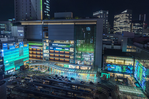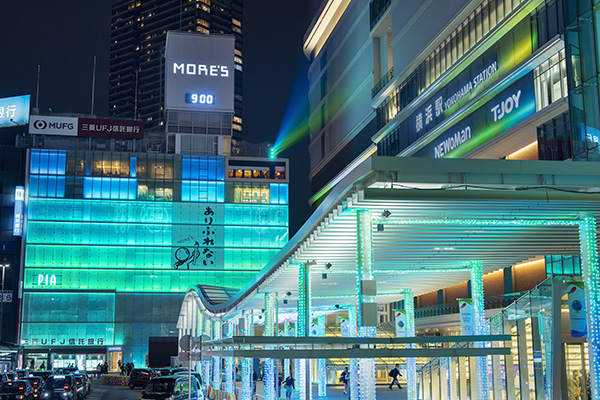 横浜モアーズ壁面では、フルカラーLEDによるライティングで、鮮やかな色の変化とダイナミックな動きで迫力ある演出を実現する。