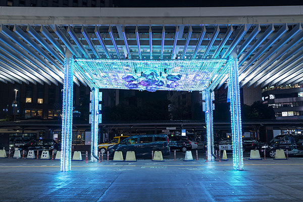 横浜駅中央西口駅前広場の大屋根シンボルステージでは、人の動きを感知して光・音・映像が変化するインタラクティブな仕掛けを導入。床には光の粒がきらめき、イベントロゴと花のモチーフが浮かび上がり、まるでイルミネーションの中に入り込んだような体験が楽しめる。