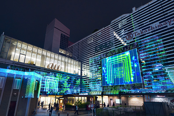 横浜タカシマヤ・ジョイナス壁面では、近未来的なグリッドデザインを軸に、音楽と連動して映像が変化し、