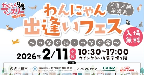 まず1つ目は保護犬・保護猫の譲渡会「わんにゃん出逢いフェス」。2月11日(水・祝)の10:30~17:00に、ウィンクあいち展示場7階で開催される。名古屋市、名古屋市獣医師会およびロイヤルカナン、カインズ、Amazonが実施。ロイヤルカナンブースでは、犬・猫用フードサンプルのプレゼントや栄養学セミナーが行われる。