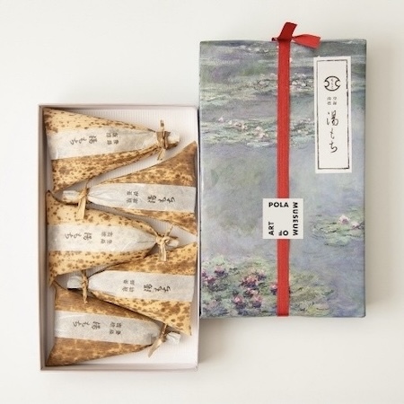 美術館の展覧会や展示品にあわせ、象徴的なアート作品を「ちもと」の御菓子の包みにあしらい、第1弾ではポーラ美術館の収蔵するクロード・モネのコレクションより『睡蓮』パッケージの「湯もち」(販売継続中)を、