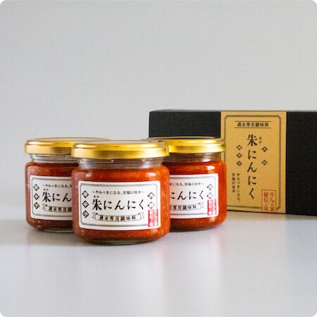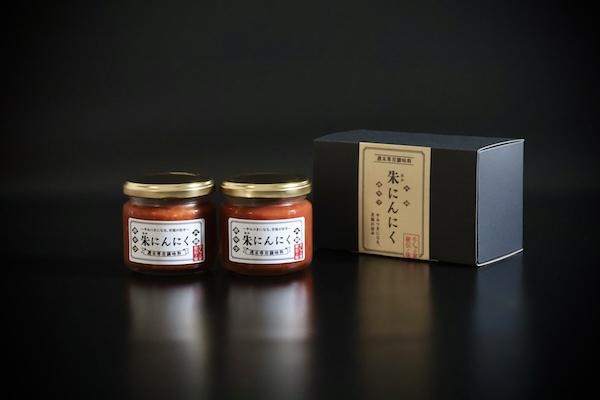「朱にんにく」は、黒を基調とした上質なパッケージと化粧箱で用意している。背景にある物語とともに贈ることで、何を贈るかだけでなく、なぜこれを選んだのかという想いまで伝えることができる調味料となっている。