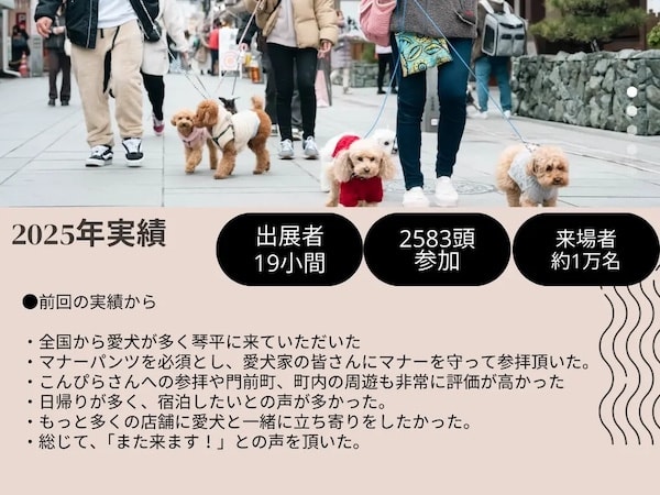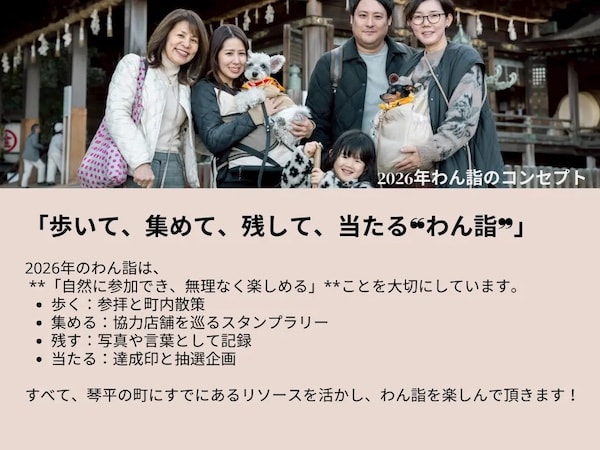 「2026年 わん詣〜わんこの三が日〜」は、人の初詣のように「愛犬の一年を願い、共に町を歩く」ことを目的とした取り組み。金刀比羅宮周辺を舞台に、参拝・町内散策・スタンプラリーなどを通じて犬と人、地域がゆるやかにつながる体験を提供する。