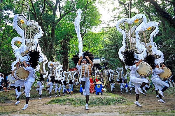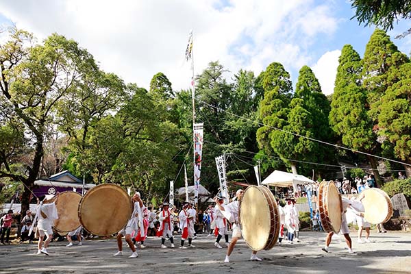 「伊作太鼓踊」は、伊作島津4代当主の戦勝を祝って始まった勇壮な伝統芸能だ。太鼓と鉦(かね)の響きに合わせ、踊り手が力強く舞い、地域の誇りとして今も受け継がれている。毎年8月28日に南方神社に奉納され、6地区の保存会が毎年交代で担当する。