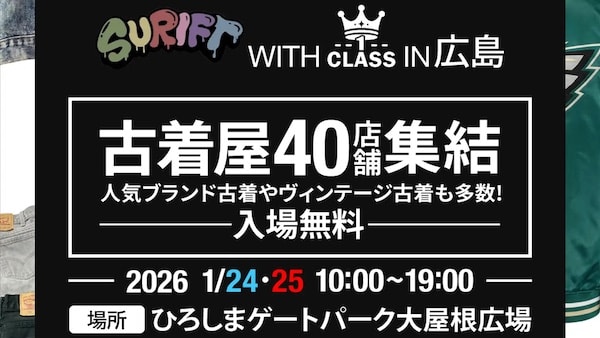 大阪府大阪市にある「RESTA」は、全国で古着イベントを開催する「SURIFT(スリフト)」と共同で、広島県広島市中区の「ひろしまゲートパーク(旧広島市民球場)」大屋根広場にて、1月24日(土)・25日(日)の2日間に大型古着イベント「SURIFT×古着卸倉庫CLASS1 in 広島」を開催する。