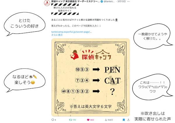 東京の店舗では満席で2時間待ちとなる日も続出する人気店になったことを受け、夢の実現と、より多くの人に謎解きの魅力を届けるため、大阪・梅田の地に新店舗をオープンするに至った。