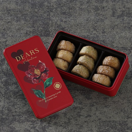 「DEARS ディアマンクッキー バレンタイン限定アソート缶」3,000円(税抜)は、深紅の缶にツバキの花をあしらったロマンティックなバレンタイン限定パッケージ。凛とした美しさと静かな華やかさを併せ持つデザインは、甘すぎない大人のバレンタインをイメージしている。