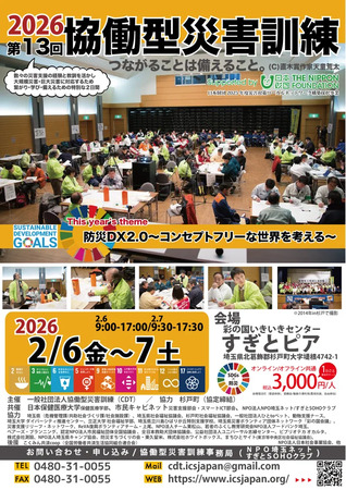 第13回協働型災害訓練in杉戸「防災DX2.0〜コンセプトフリーな世界を考える〜」は、会場とオンラインで開催され、参加の対象は、最新の災害支援が知りたい人や団体、ICSを学びたい防災担当者、関係者、災害支援の仲間と出会いたい人や団体など。定員は会場参加100名・zoom参加200名だ。
