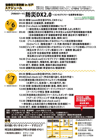 2日間にわたり、「【看護と防災DX】看護学科2年次生により杉戸宿地域踏査の発表」「【ペットと防災DX】知っておきたいペット防災啓発の現状」「【県域支援と防災DX】タイムライン作成訓練」「【食糧支援と防災DX】フードバンクセミナー2026」などが実施される。