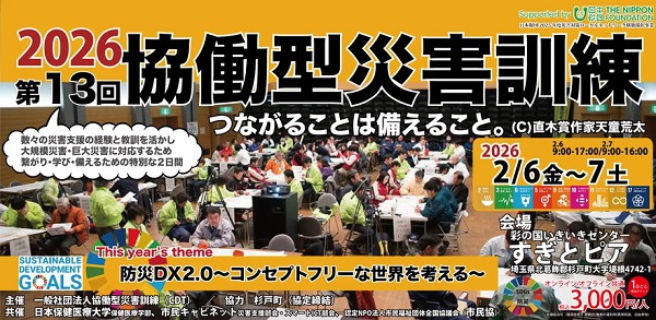 2014年国土交通省「広域的地域間共助推進事業」としてスタートし、「これまでの震災の経験と教訓を、来るべき大規模災害に活かすこと」をモットーに毎年開催を重ねている協働型災害訓練が、2月6日(金)・7日(土)の2日間、彩の国いきいきセンターすぎとピアとZoom(オンライン)にて、第13回協働型災害訓練in杉戸「防災DX2.0〜コンセプトフリーな世界を考える〜」を開催。現在、Peatixにて参加チケットが販売されている。