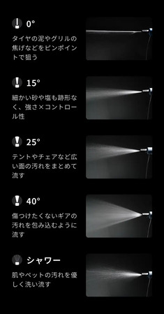 低圧モードやシャワーモードは、壊れやすいものや、人・ペットの体に直接使うことを想定したやさしい水流で、アクティビティ後や散歩のあとの汚れを“洗う”のではなく、“その場でリセット”することが可能だ。