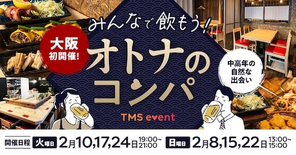 全国で婚活イベントを展開する「トータルマリアージュサポート」が運営する「TMSイベントポータル」は、40代・50代・60代の中高年層を対象とした新しい交流イベント「みんなで飲もう!オトナのコンパ」を、大阪ミナミの炉端焼き屋「炉ばたワコー」にて定期開催することを決定した。