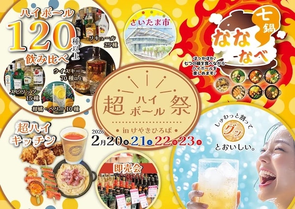 「梅酒研究会」は2月20日(金)〜2月23日(月・祝)の期間、埼玉県さいたま市中央区のさいたま新都心「けやきひろば」で、体験型フェス「超ハイボール祭inけやきひろば」を初開催する。熱々の鍋が楽しめる「なななべ」も同時開催。