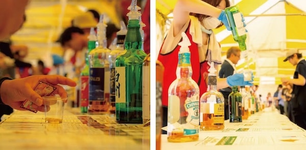 即売会場「超ハイバザール」もある。飲み比べ会場で好みのハイボールと出会ったら、ここでベースの酒を購入できる。「超ハイバザール」も120種以上の酒を用意。なお銘柄によっては数に限りがあり、品切れとなる場合がある。