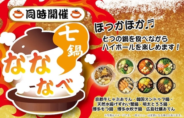 「超ハイボール祭inけやきひろば」では、あったか企画「なななべ」も同時開催される。寒い季節だからこそ楽しんでほしい全7種類の鍋を一度に楽しめる。全国各地の人気鍋を味わえる、この時期ならではの食べ比べ企画になっている。