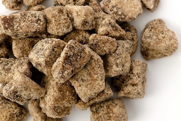 「Mehl」のブッターシュタンゲンは、ドイツで親しまれるブレッツェル生地を細長く成形しクリームを挟んだ焼き菓子だ。今回、「うまいもんドットコム」に新たに登場した沖縄黒糖のブッターシュタンゲンには、黒糖クリームを挟んでいる。生地にはほどよい塩味と香ばしさがあり、黒糖は一度キャラメル状に煮詰めて香りとコクを凝縮。さらに黒糖をまとわせたアーモンドスライスをトッピングすることで、食感と風味のアクセントを添えている。ひと口目から沖縄黒糖ならではのやさしい甘さが広がる、奥行きのある味わいだ。