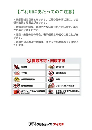 「リサイクルショップアイスタ 富士見市鶴瀬店」は、店頭での不用品の買取・資源買取を行うリサイクルショップ業態。家電・家具・ブランドといった生活雑貨などの店頭買取、リユースとして価格のつかない商品の資源買取を行う。